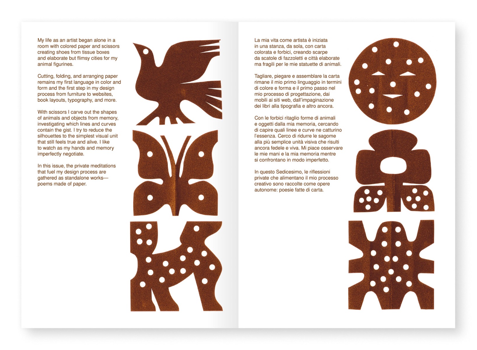 “My life as an artist began alone in a room with colored paper and scissors creating shoes from tissue boxes and elaborate but flimsy cities for my animal figurines. Cutting, folding, and arranging paper remains my first language in color and form and the first step in my design process from furniture to websites, book layouts, typography, and more. With scissors I carve out the shapes of animals and objects from memory, investigating which lines and curves contain the gist. In this issue, the private meditations that fuel my design process are gathered as standalone works—poems made of paper.”