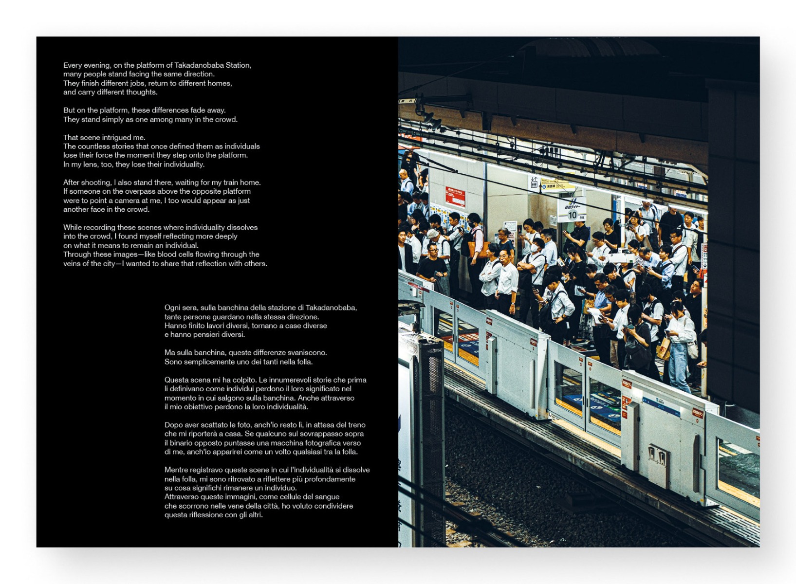 Every evening, on the platform of Takadanobaba Station, many people stand facing the same direction. They finish different jobs, return to different homes, and carry different thoughts. But on the platform, these differences fade away. They stand simply as one among many in the crowd. That scene intrigued me. The countless stories that once defined them as individuals lose their force the moment they step onto the platform. In my lens, too, they lose their individuality. After shooting, I also stand there, waiting for my train home — Karlkanitrunk