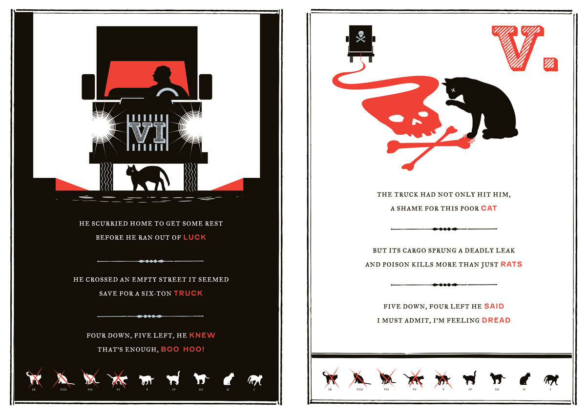 L’avventurosa ricerca visiva di Un Sedicesimo prosegue a ritmo di ballata e ci cala nella tragica escalation di disgrazie cui si imbatte il gatto Tom. Nove vite da bruciare in un incalzante conto alla rovescia che pagina dopo pagina conduce il povero malcapitato alla sua ultima vita.